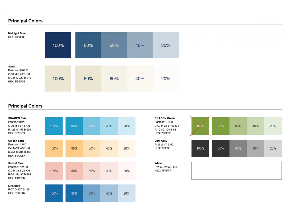 The SKAGEN colors are adjusted to meet the contrast requirements in Web Content Accessibility Guidelines (WCAG). Following these guidelines will make content accessible to a wider range of people with disabilities. Dark grey should be used on all digital text.