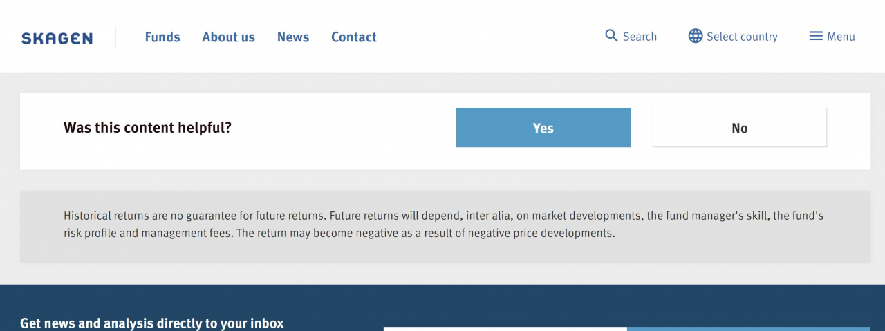 Historical returns are no guarantee for future returns. Future returns will depend, inter alia, on market developments, the fund manager’s skills, the fund’s risk profile and management fees. The return may become negative as a result of negative price developments. There is risk associated with investing in funds due to market movements, currency developments, interest rate levels, economic, sector and company-specific conditions. The funds are denominated in NOK. Returns may increase or decrease as a result of currency fluctuations. Prior to making a subscription, we encourage you to read the fund's prospectus and key investor information document. An overview of costs can be found at www.skagenfunds.com/costs